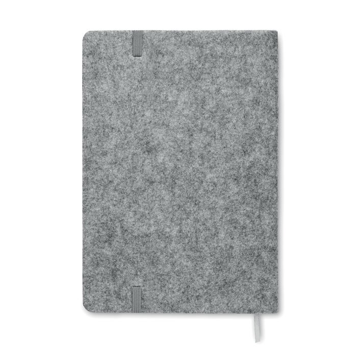 A5 notebook with RPET felt cover and cork. 160 recycled paper lined pages (80 sheets). Elasticated pen loop on front, matching elastic closure strap and ribbon page-marker.